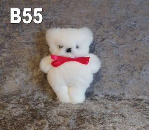 Bamse i hvid og lysegrå mink med grå sløjfe.