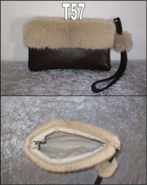 Taske/clutch i hvid mink, kombineret med mørkegrå læder.