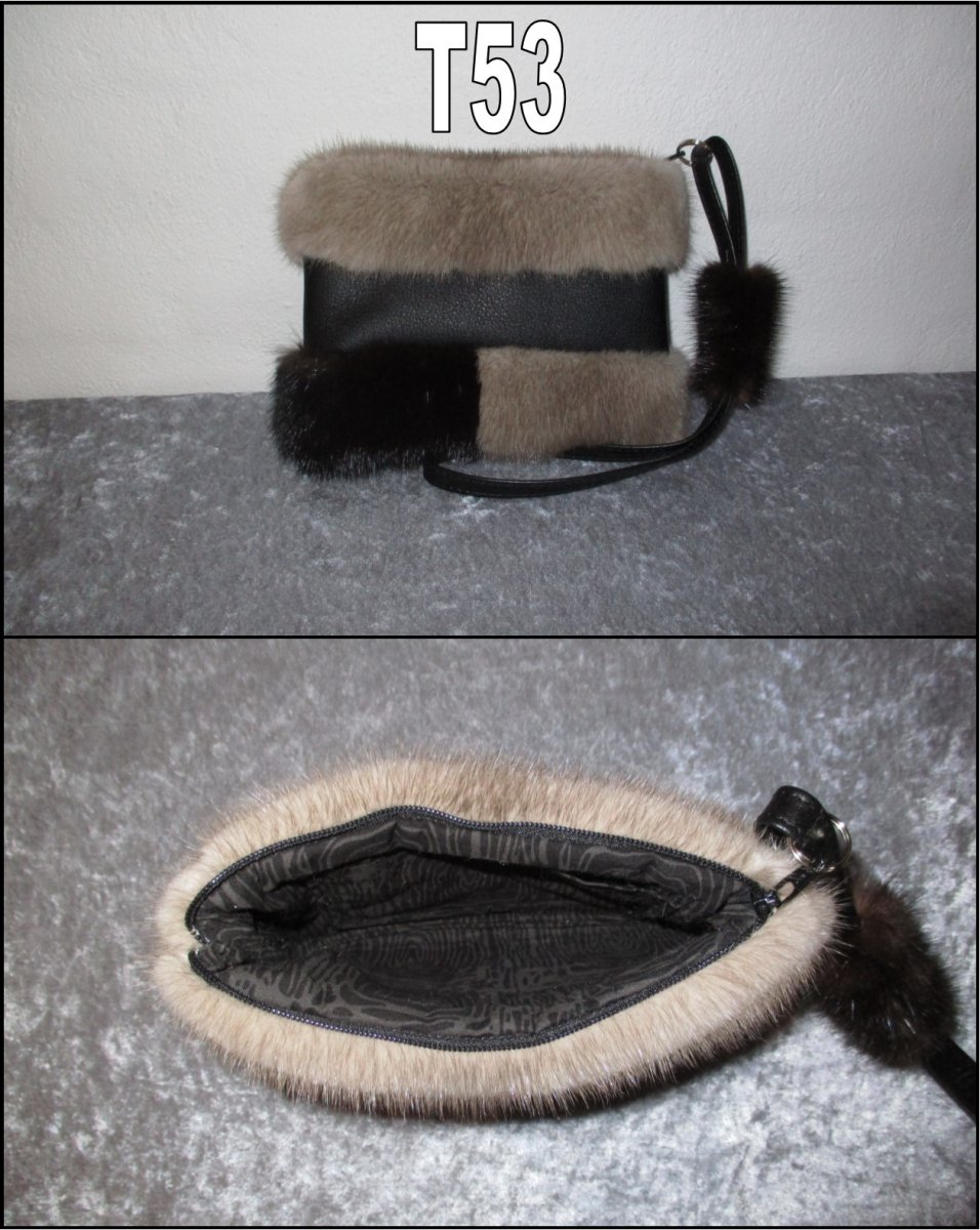 Taske/clutch i grå og brun mink, kombineret med sort læder.