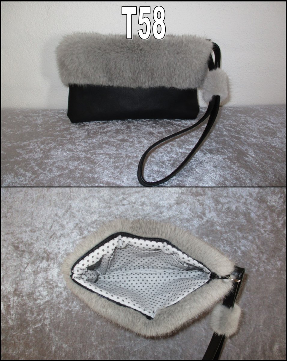Taske/clutch i lysegrå mink, kombineret med sort læder.